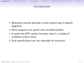 This document discusses using relations and relational calculus to specify programs in a more natural way. It proposes enhancing data types with invariants to tame non-determinism and partiality in relational specifications. This allows inferring checkable domain and range predicates for relations to optimize execution. Bidirectional transformations are also specified relationally to maximize updatability.