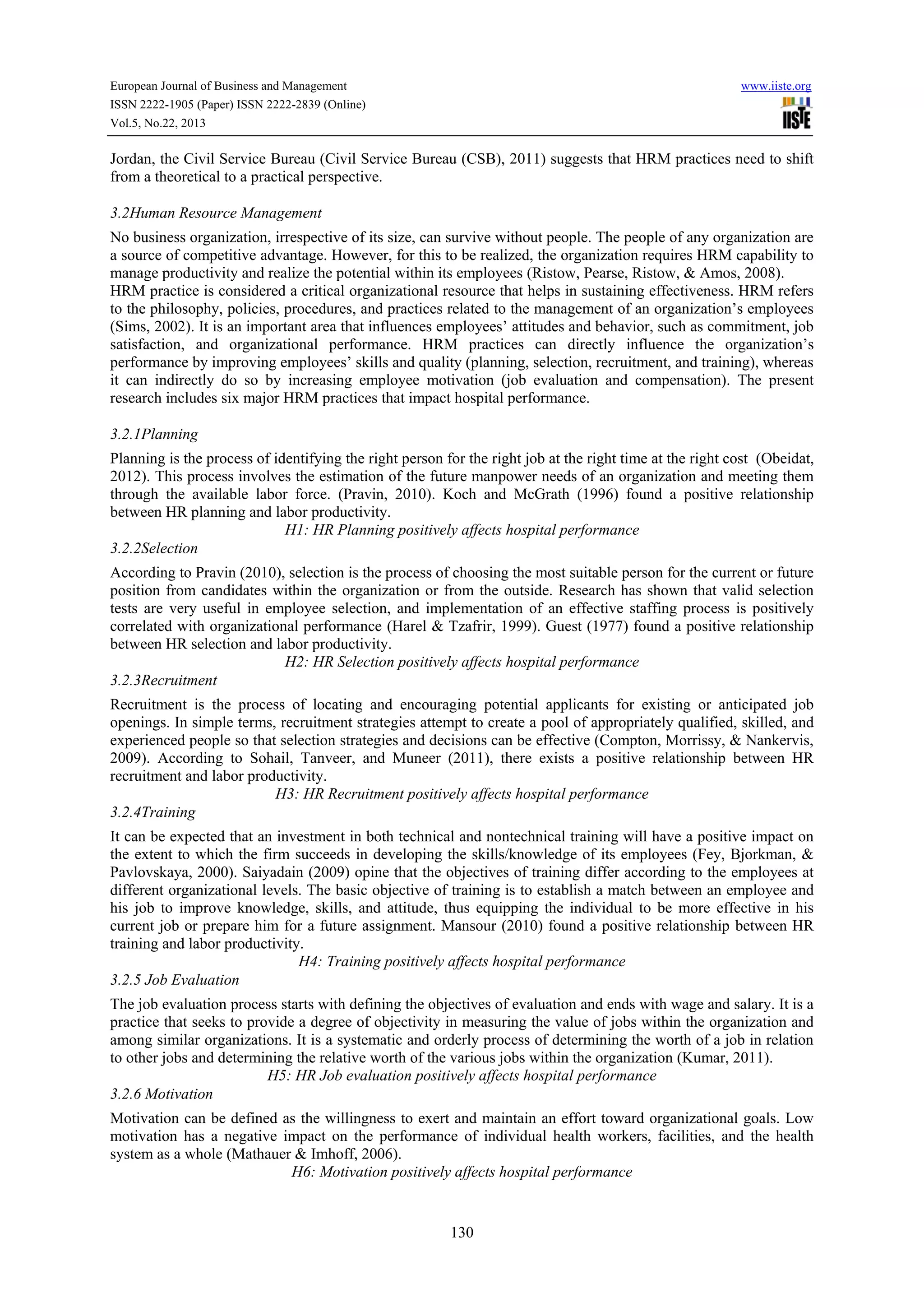 This document summarizes a study that examined the relationship between human resource management (HRM) practices and employee performance in 5 hospitals in Jordan. The study found that HRM practices, such as planning, selection, recruitment, training, job evaluation, motivation, and compensation, can impact hospital performance. A survey was administered to hospital staff to understand the current HRM practices and their effect on performance. The results showed that HRM practices in Jordanian hospitals need improvement and that compensation had the greatest impact on increasing employee performance levels. The document provides context on the healthcare workforce in Jordan and reviews literature on the relationship between various HRM practices and organizational performance.