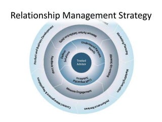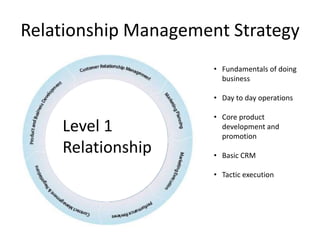 The document outlines a 4-level relationship management strategy that moves from basic operations and CRM at level 1 to a deep, collaborative relationship where the partner sees the company as a key resource and advocate for their business at level 4. It describes the key activities at each level including measurement of satisfaction, feedback, understanding challenges, and providing strategic solutions to help partners.