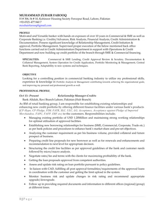 Muhammad Zubair Farooq is a seasoned banker with over 10 years of experience in commercial and SME banking, specializing in credit administration, risk analysis, and portfolio management. Currently serving as a relationship manager at Bank Alfalah, he manages a portfolio worth USD 1.20 million and oversees new credit relationships, while previously holding roles in credit analysis and administration. He holds an MBA in finance and has participated in several professional training seminars to enhance his banking skills.