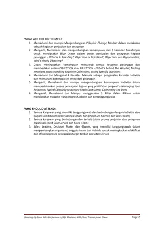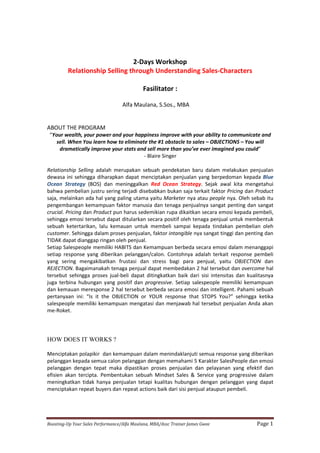 Dokumen ini adalah panduan untuk workshop tentang penjualan melalui pemahaman karakter penjual dan konsumen, yang ditujukan untuk meningkatkan keterampilan penjualan dan pelayanan dalam konteks strategi Blue Ocean. Workshop ini akan membahas cara mengatasi keberatan dan penolakan dari pelanggan serta pentingnya membangun hubungan yang positif dan progresif untuk menciptakan pelanggan yang loyal. Peserta diharapkan dapat mengembangkan pola pikir yang positif dan memahami karakter individu dalam proses penjualan.