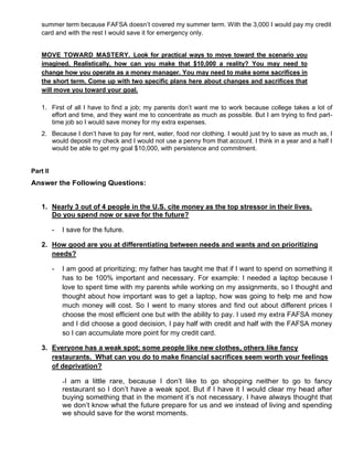 Katherine describes her relationship with money as focused on saving for the future and helping her parents. She values spending money on important situations and helping her family. As a money manager, she sees herself as a planner. Her culture views money as necessary for certain things, but her friends and family don't influence her views and her parents spend money wisely. If she had an extra $10,000, she would give $5,000 to help her parents and use the rest to pay debts and save for emergencies. To achieve this, she plans to find a part-time job and save her earnings without spending.