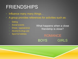 The document discusses the importance and complexity of relationships, including friendships and family structures, and their influences on individuals throughout different life stages. It highlights the negative aspects of relationships, such as bullying and abuse, and provides guidance on recognizing and addressing these issues. Additionally, it emphasizes the value of positive interactions and supportive networks in fostering healthy relationships and personal well-being.