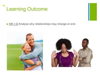 This document summarizes several theories for why relationships change and end, including the triangular theory of love, social exchange theory, the investment model of commitment, equity theory, and additional factors. It discusses key concepts such as satisfaction, commitment, alternatives, investments, rewards/costs, communication patterns, and perceptions of equity that can impact relationship stability and likelihood of breakup. Research studies are summarized that investigate how these concepts predict whether relationships last or end.