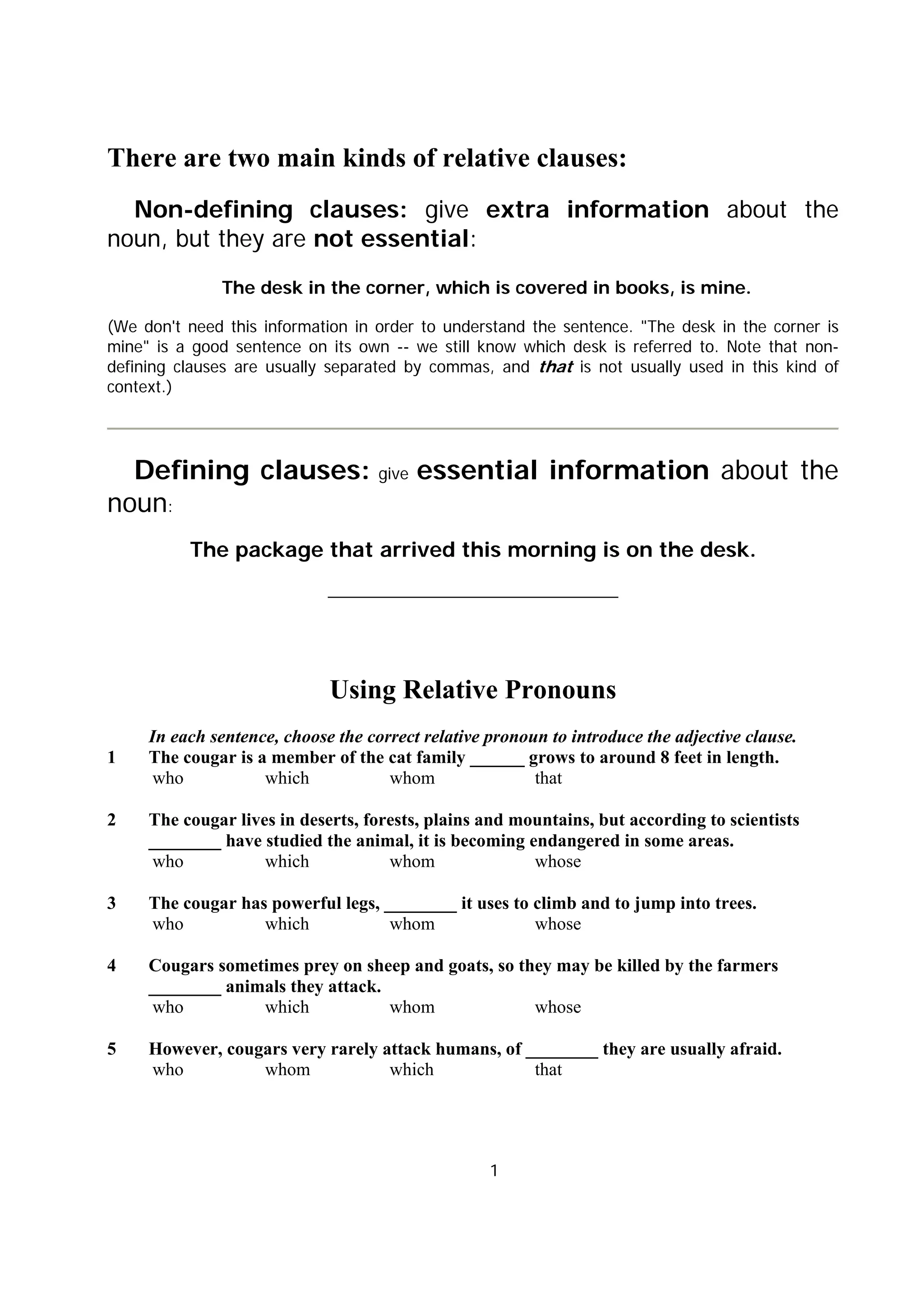 2) Defining clauses which provide essential information about a noun.