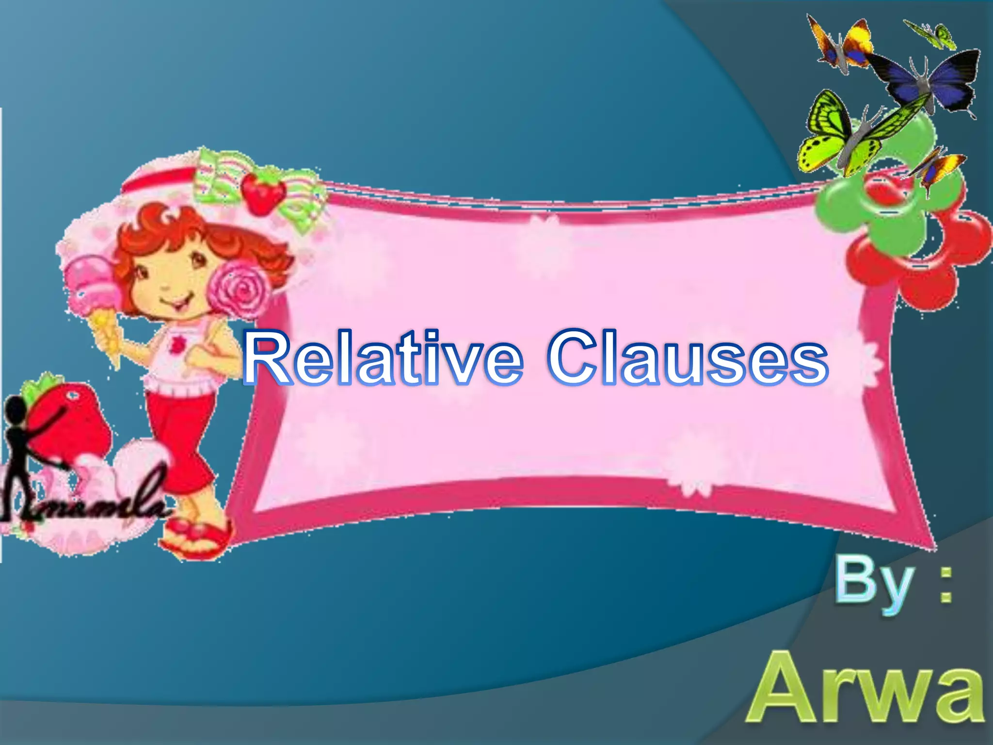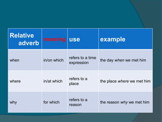 The document discusses relative clauses and relative pronouns. Relative clauses are used to join two sentences together or provide additional information about something. Relative pronouns include who, whom, which, whose, and that. Relative adverbs include where, when, and why. The document provides examples of using relative clauses and choosing the correct relative pronoun or adverb. It also discusses whether the relative pronoun acts as a subject or object in the clause.