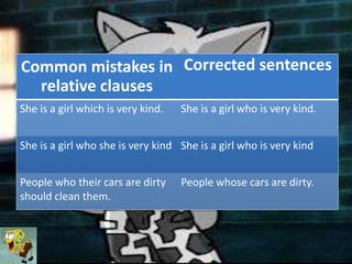 Relative clauses are subordinate clauses that modify a noun phrase and typically begin with who, which, or whose. Who and which are used to refer to people or things, while whose shows possession. Common mistakes include adding extra pronouns after who or which, since these pronouns already take the place of pronouns like he or she. Relative clauses can also be used without an explicit relative pronoun in informal English.
