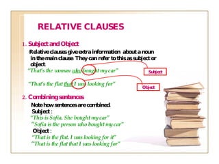This document discusses relative clauses and how they are used in English. It covers defining vs non-defining relative clauses and the relative pronouns that can be used, including who, which, that, whose, and whom. It provides examples of relative clauses used as subjects and objects. It also discusses omitting relative pronouns in defining clauses and the use of prepositions. Exercises are included to practice using relative pronouns correctly.