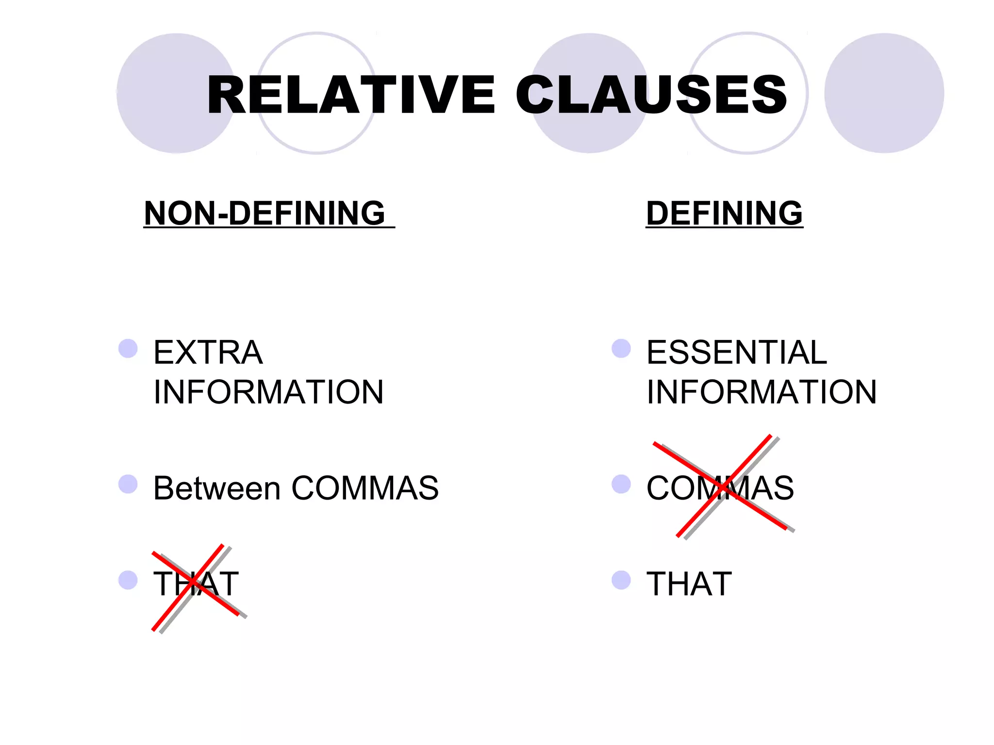 This document provides an overview of basic relative pronouns and clauses in English. It discusses defining and non-defining relative clauses, and the relative pronouns that can be used to introduce each type of clause (e.g. that, which, who, whose, when, where). It also covers cases where the relative pronoun can be omitted and distinguishes between the words "whose" and "who's". Examples are provided throughout to illustrate the different concepts.