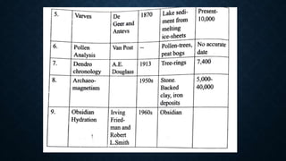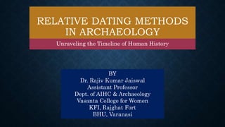 The document discusses relative dating methods in archaeology, emphasizing their importance in establishing timelines, interpreting cultural changes, and understanding contextual relationships of artifacts. Key techniques mentioned include stratigraphy, typology, pollen analysis, seriation, and various absolute dating methods like radiocarbon dating and dendrochronology. These methods allow archaeologists to organize artifacts chronologically, compare different cultures, and reconstruct past environments based on geological and archaeological materials.