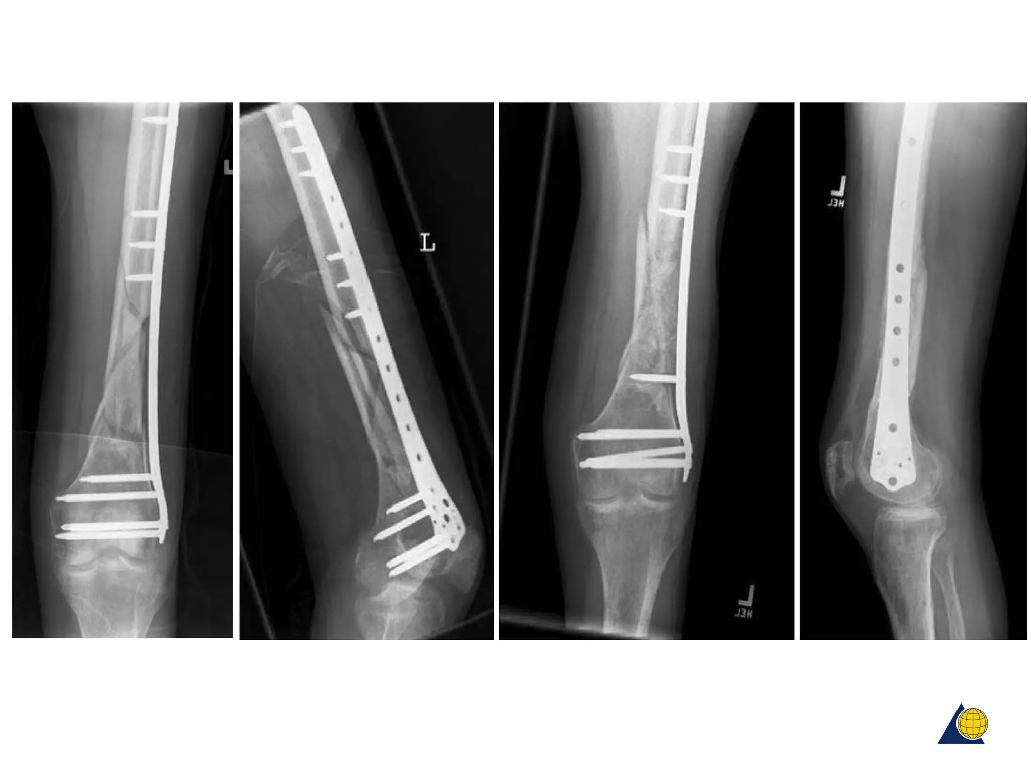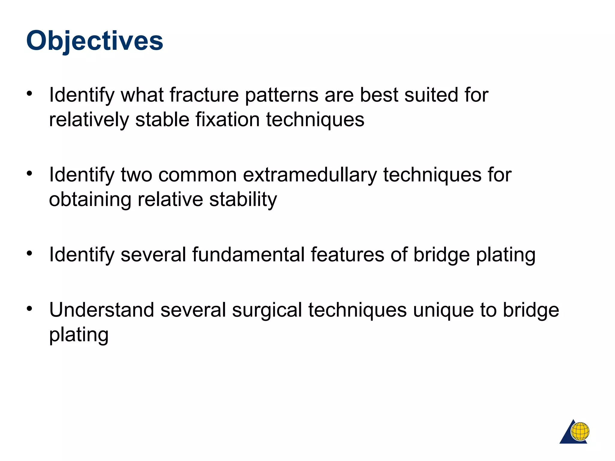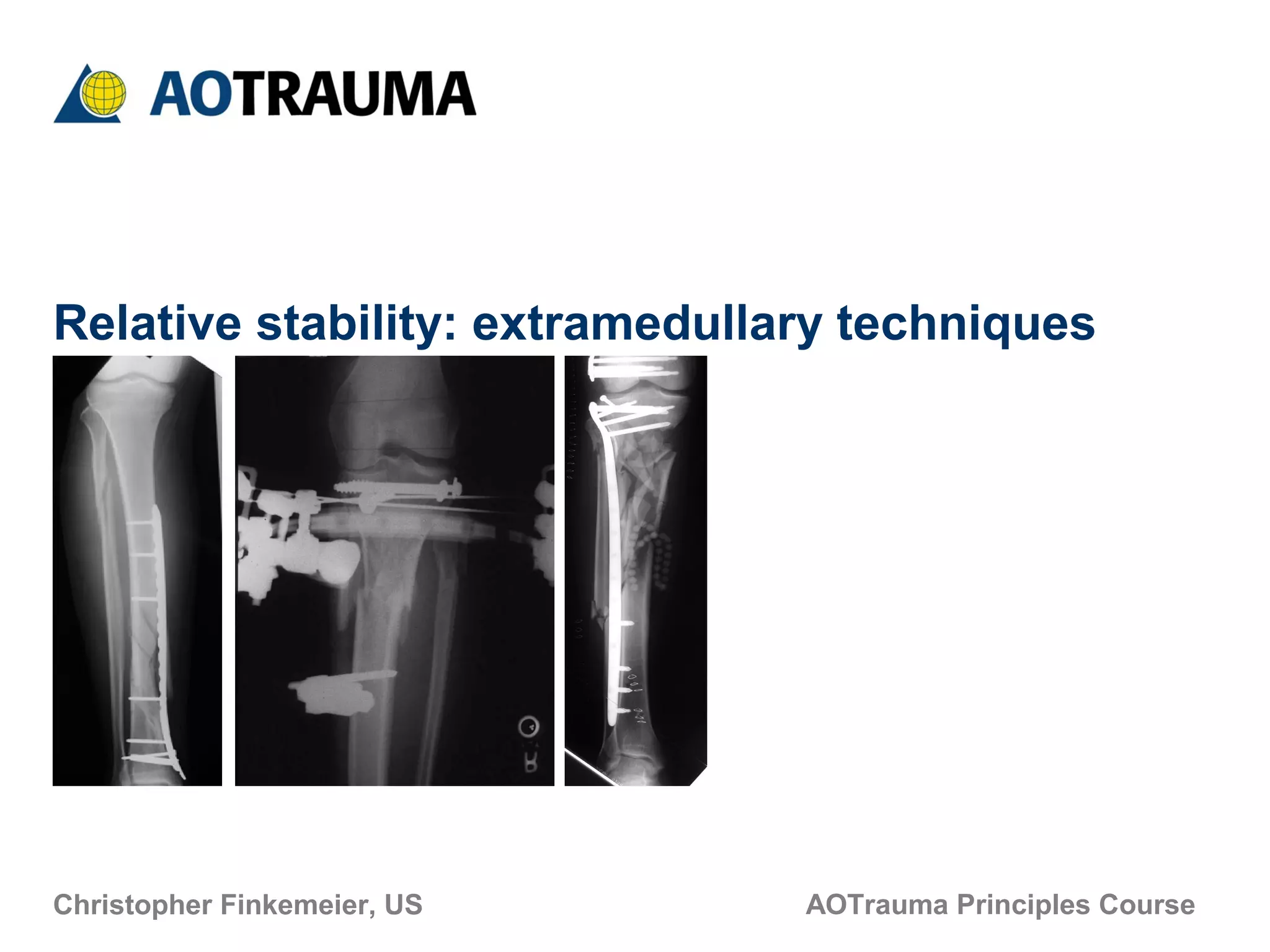 This document discusses techniques for obtaining relative stability in fractures using extramedullary fixation methods. It describes ideal fracture patterns for relatively stable fixation, such as multifragmentary diaphyseal and metaphyseal fractures. Two common extramedullary techniques are discussed: external fixation and bridge plating. The aim of these techniques is to preserve fracture site vascularity and provide sufficient stabilization for union.