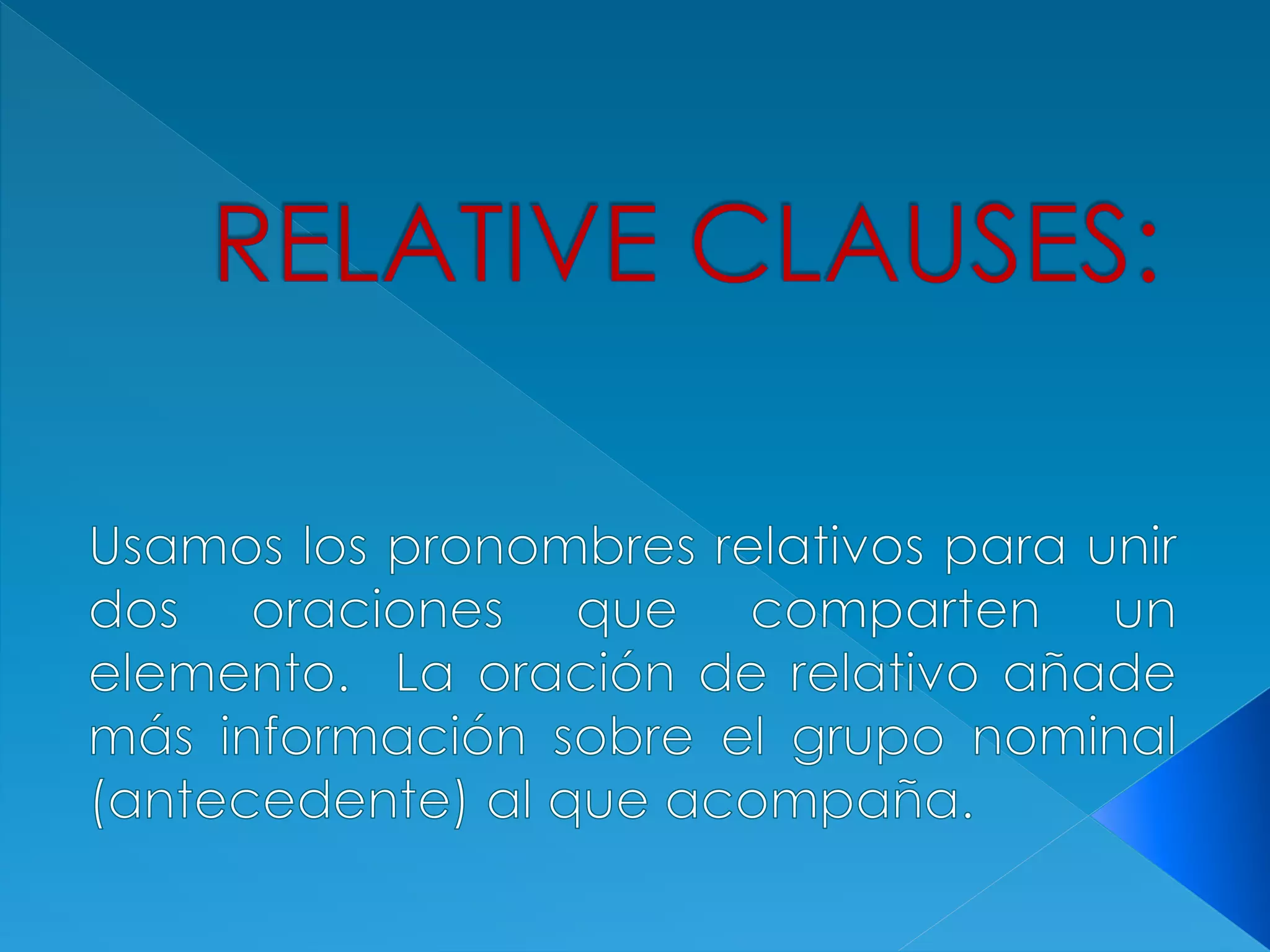 The document discusses the use of relative pronouns in English and Spanish. It provides examples of relative pronouns used to join clauses, including who, which, that, where, whose, when. It notes some differences in usage between defining and non-defining relative clauses, and how relative pronouns can be omitted in some cases but not others depending on their function in the sentence. Finally, it provides exercises joining sentences using relative pronouns.