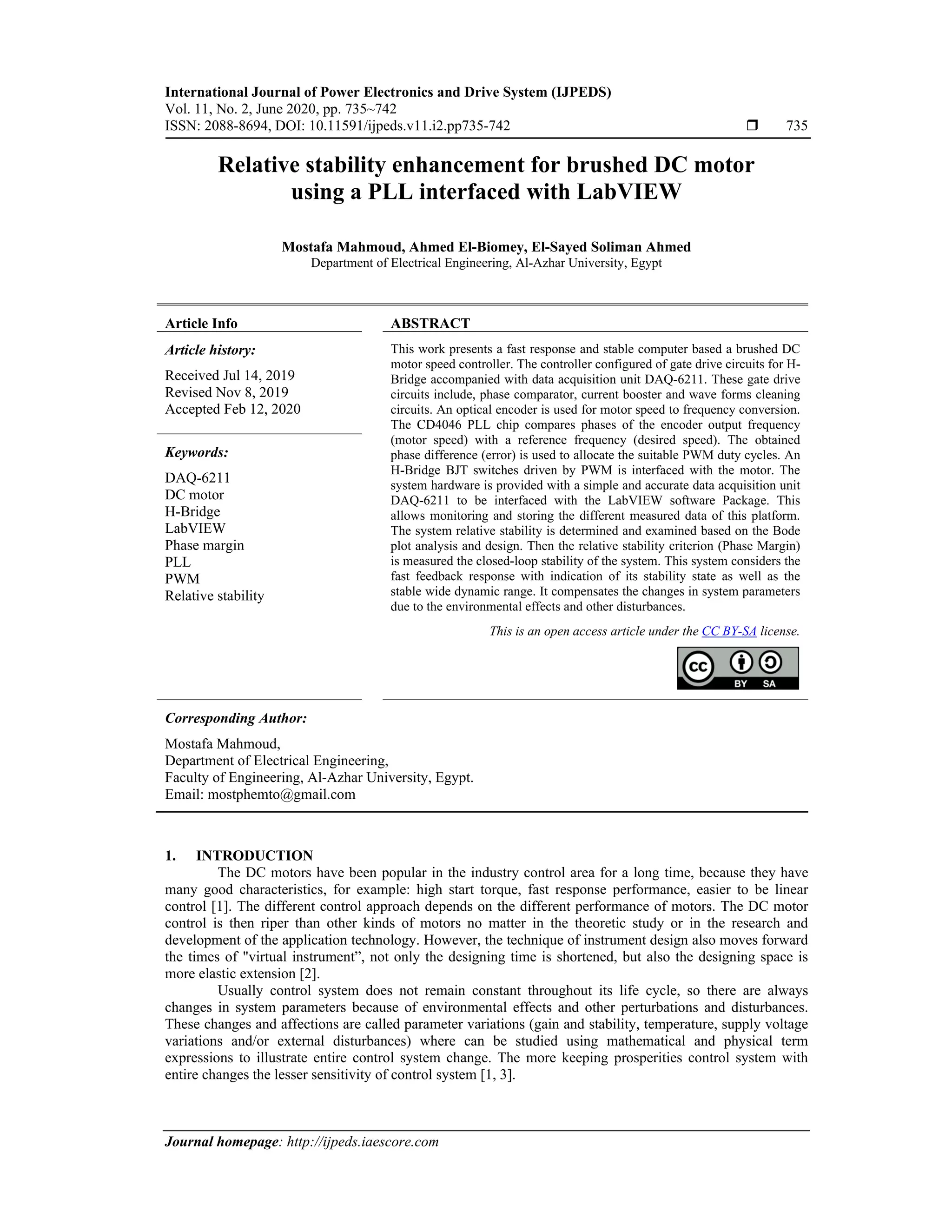 This document discusses the design and implementation of a brushed DC motor speed controller using a phase-locked loop (PLL) and LabVIEW software for data acquisition and monitoring. The system aims to enhance relative stability and fast response by utilizing components such as optical encoders and H-bridge circuits, while considering various load conditions and their effects on motor performance. Experimental results show a stable operational range of the motor across specified speeds and loads, validating the effectiveness of the proposed control strategy.