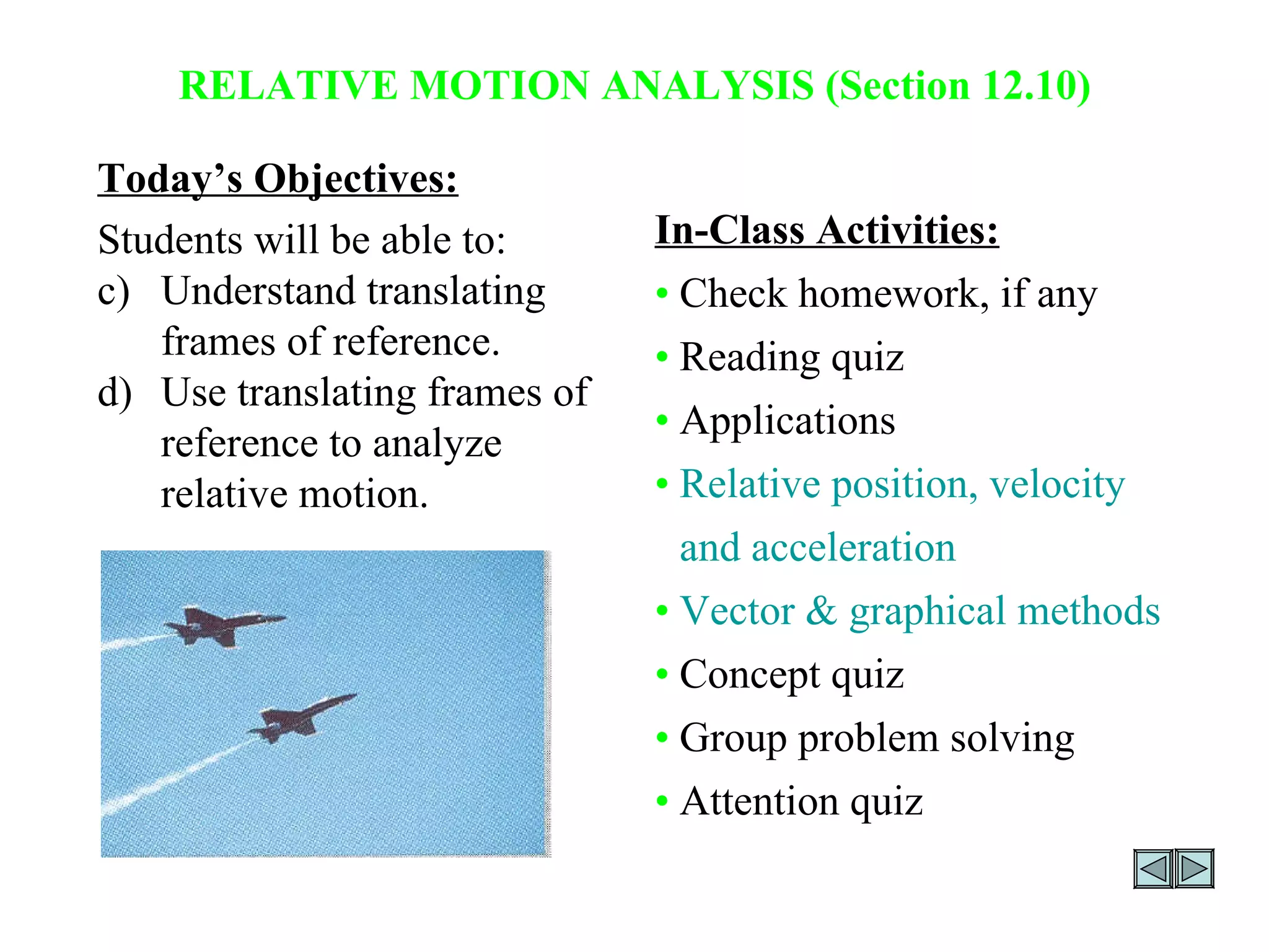 The document provides an overview of the objectives and activities for a lesson on relative motion analysis. It includes sample problems and questions on determining relative position, velocity, and acceleration between two moving frames of reference using vector methods and trigonometric relationships like the laws of sines and cosines. Sample problems demonstrate how to set up and solve for unknown relative motion variables graphically or through vector equations.