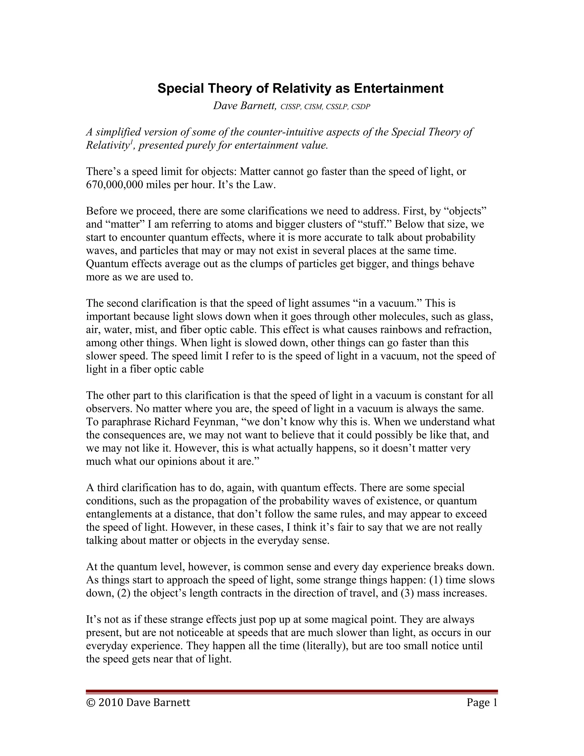 The document summarizes some key aspects of Einstein's Special Theory of Relativity in an entertaining way. It explains that (1) nothing can travel faster than the speed of light, which is constant for all observers; (2) as objects approach the speed of light, time slows down, length contracts, and mass increases to account for the constant speed of light; and (3) these effects have been observed in particle accelerators where particles swell in mass as they near the speed of light.