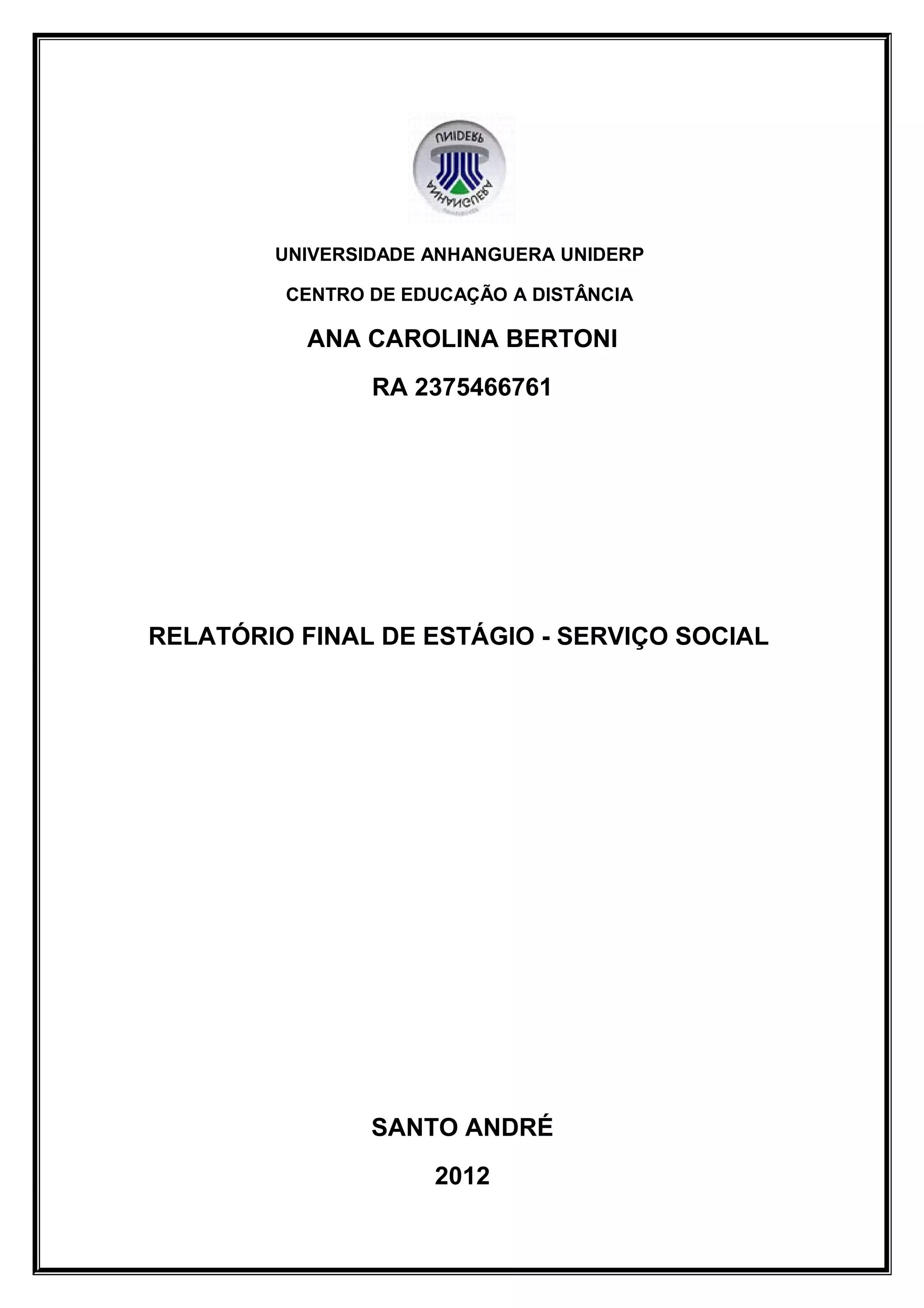 O documento relata o relatório final de estágio da estagiária Ana Carolina Bertoni realizado no Hospital e Maternidade Bartira em Santo André entre abril e junho de 2012. O estágio teve como objetivo geral a interação entre a estagiária, a supervisora de campo e o professor-tutor e como objetivos específicos trabalhar as três dimensões da prática profissional: teórico-metodológica, ético-política e técnico-operativa. A estagiária descreve sua atuação no hospital sob a orientação da supervisora de