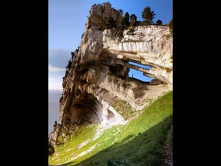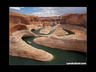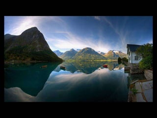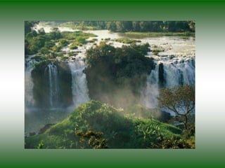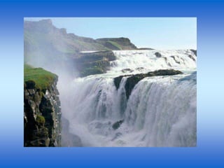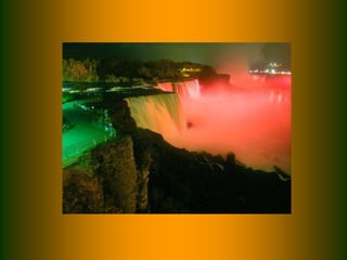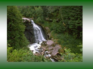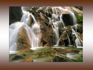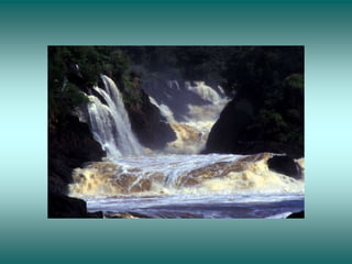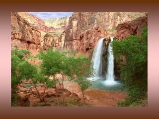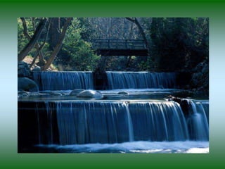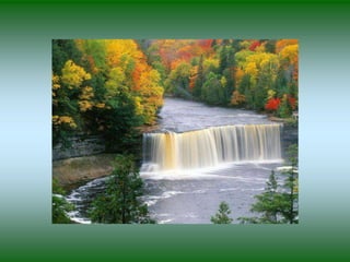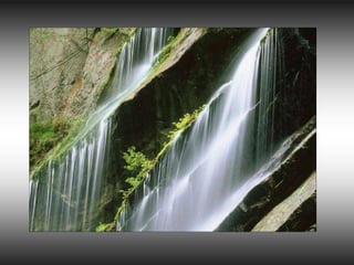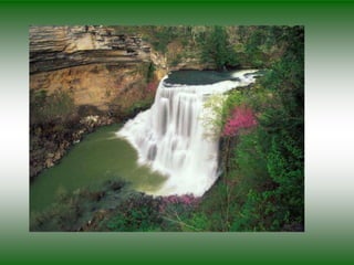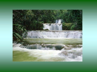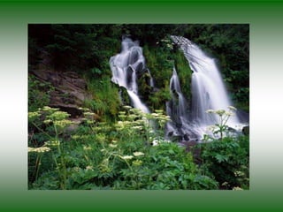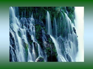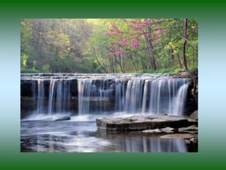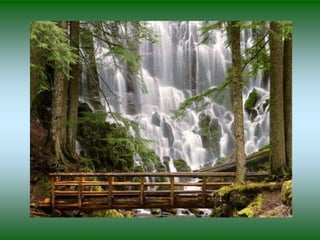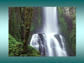 This document contains photos of relaxing natural scenes including waterfalls along the Columbia River in Oregon, USA and El Nicho Falls in the Sierra de Trinidad mountains in Cuba. Spiritsofnature by Yanni is listed as the background music.