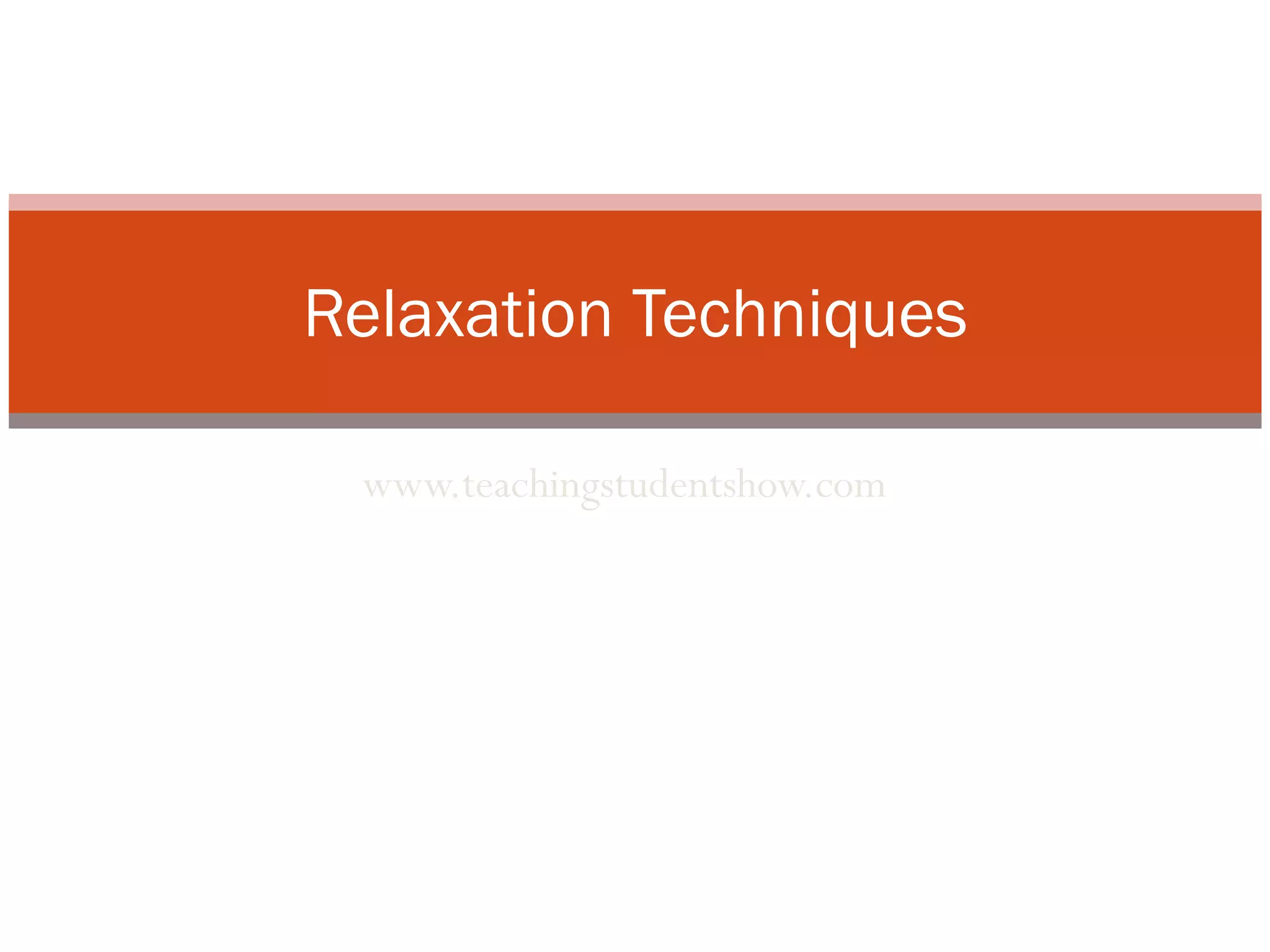 The document discusses three relaxation techniques that students can use to reduce stress and anxiety. The first technique involves tensing and relaxing different muscle groups one at a time from head to toe. The second recommends positive self-talk and deep breathing before a test while visualizing being calm and prepared. The third has the student tense all muscles at once from head to toe before slowly relaxing each part of the body.