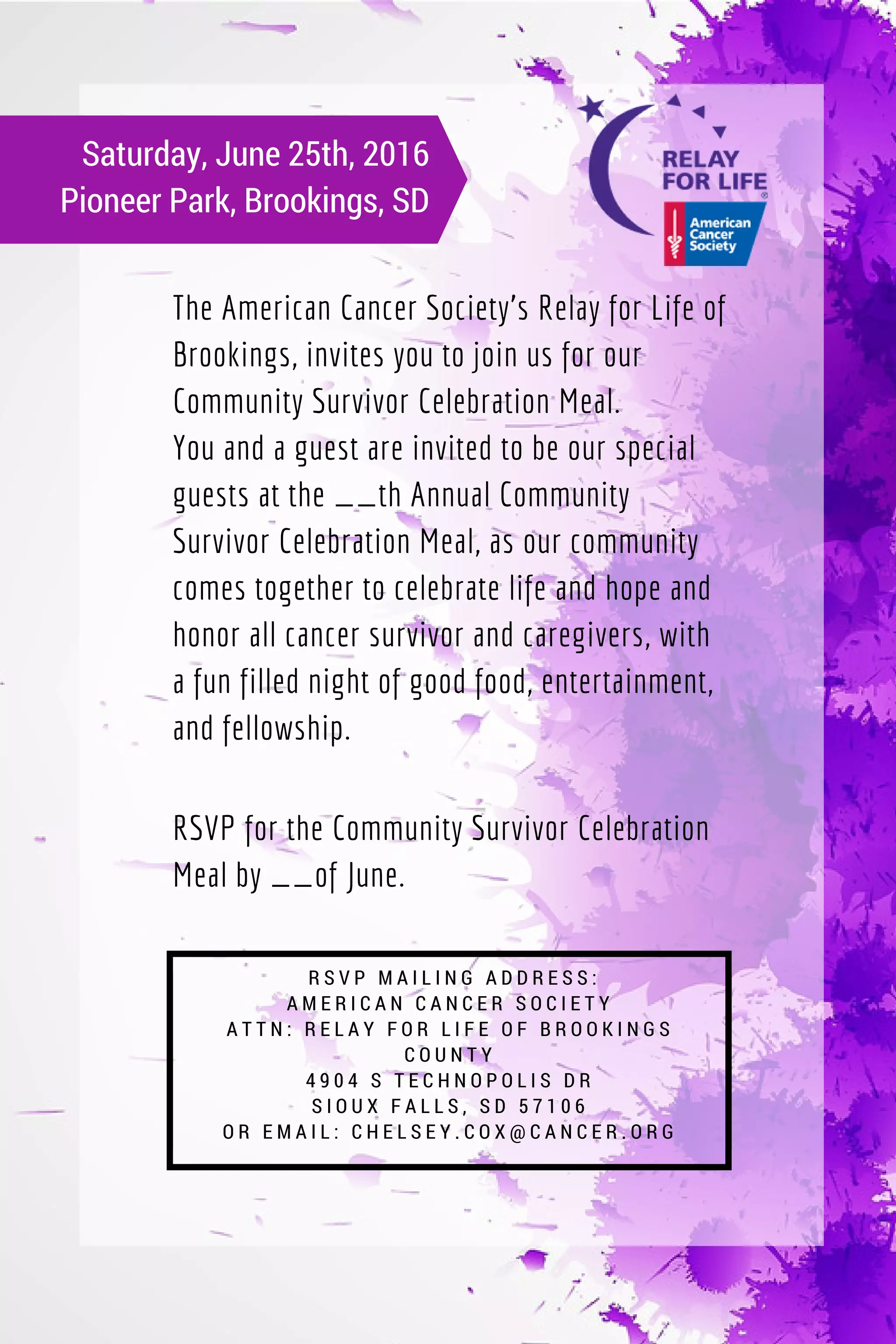 The American Cancer Society's Relay for Life of Brookings invites cancer survivors and their guests to attend the __th Annual Community Survivor Celebration Meal on June 25th, 2016 at Pioneer Park in Brookings, SD. The event will celebrate survivors, caregivers, and those who have battled cancer, with food, entertainment, and fellowship. RSVPs for this special meal are requested by a certain date of June.