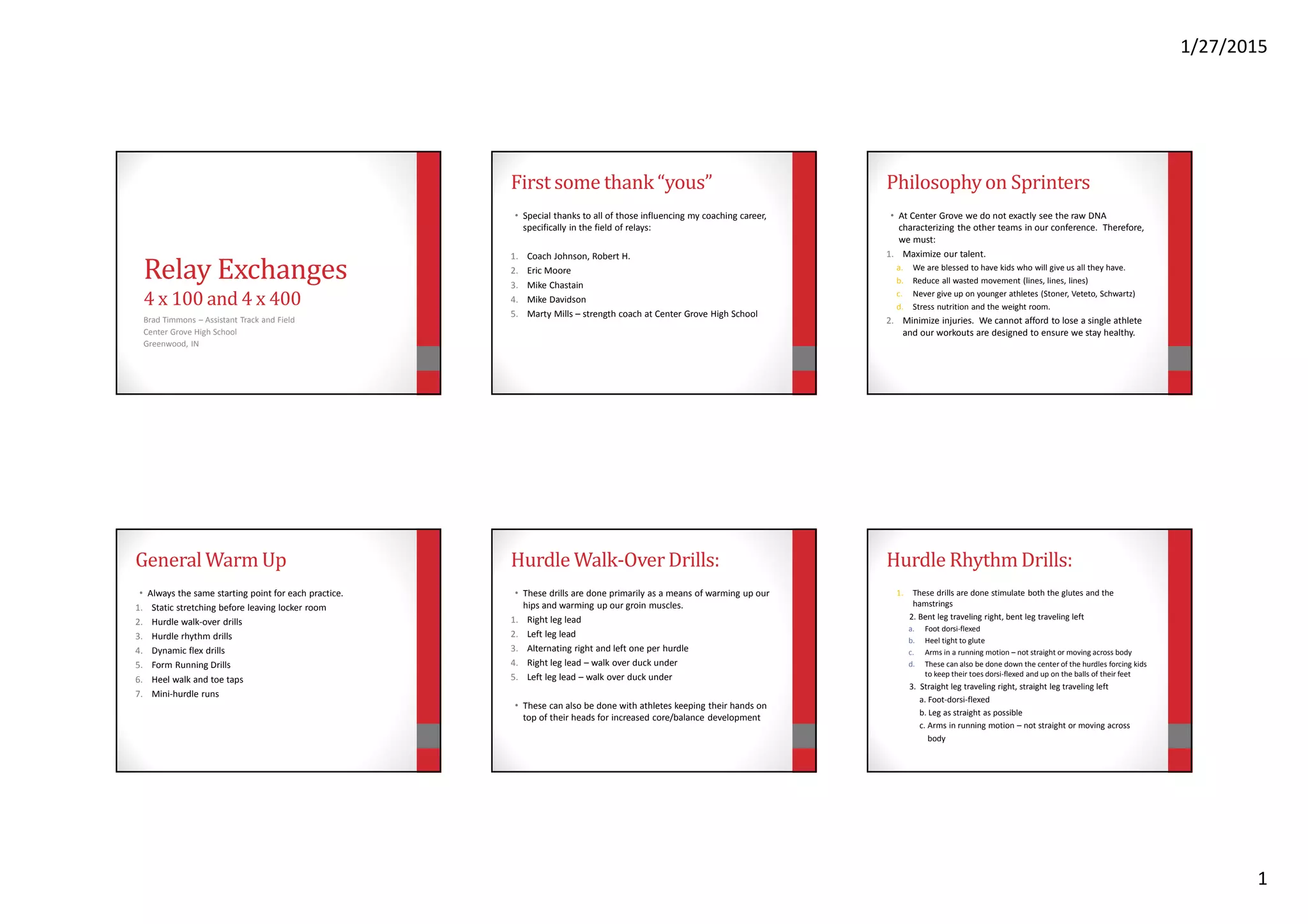 Brad Timmons outlines his philosophy and drills for the relay teams at Center Grove High School. He emphasizes maximizing talent through reducing wasted movement, stressing nutrition and strength training. General warmups include static stretching, hurdle drills to warm hips and groin, and dynamic flexibility drills. Running drills are always done on lines to work on rhythm and form. For the 4x100 relay, he discusses optimal personnel grouping and techniques like starting positions, exchange zones, and hand placement on baton passes. For the 4x200/400 relays, he covers spacing, reaching back to pass the baton, and responsibilities for dropped batons.