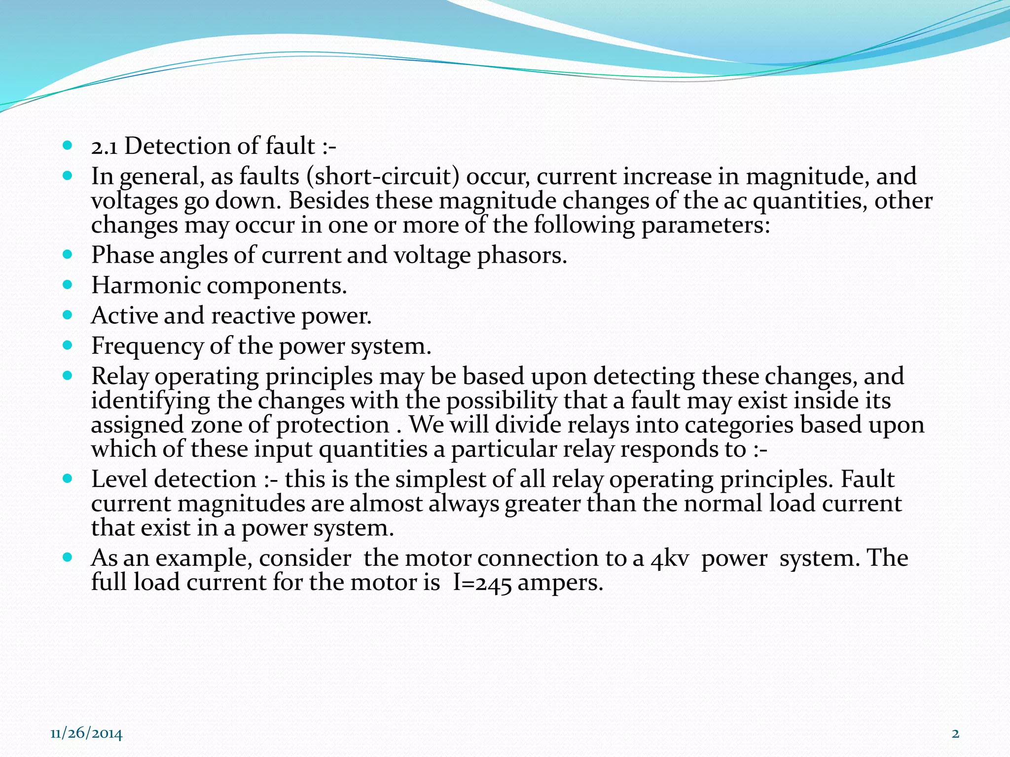 This document describes various principles of relay operation used in power systems. It discusses several categories of relays including level detection relays, magnitude comparison relays, differential relays, phase angle comparison relays, distance relays, pilot relays, harmonic content relays, and frequency sensing relays. It also describes some common relay designs such as plunger-type electromechanical relays and their operating characteristics. Relay principles can be based on detecting changes in current, voltage, phase angles, harmonic components, or frequency during fault conditions.