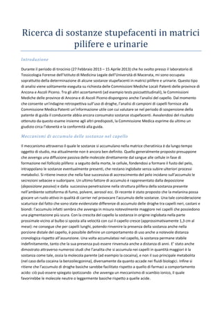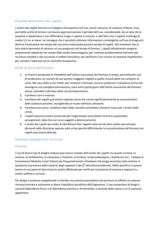 Il documento descrive la ricerca di sostanze stupefacenti in matrici pilifere e urinarie, analizzando la loro accumulazione nei capelli e la loro stabilità nel tempo per valutare l'uso retrospettivo di droghe. Vengono esplorate le fasi del prelievo e dell'analisi chimico-tossicologica, evidenziando i vantaggi dell'analisi dei capelli rispetto ad altri campioni biologici. Si sottolineano le sostanze frequentemente ricercate, come cocaina e oppiacei, e il metodo analitico utilizzato per identificare la loro presenza.