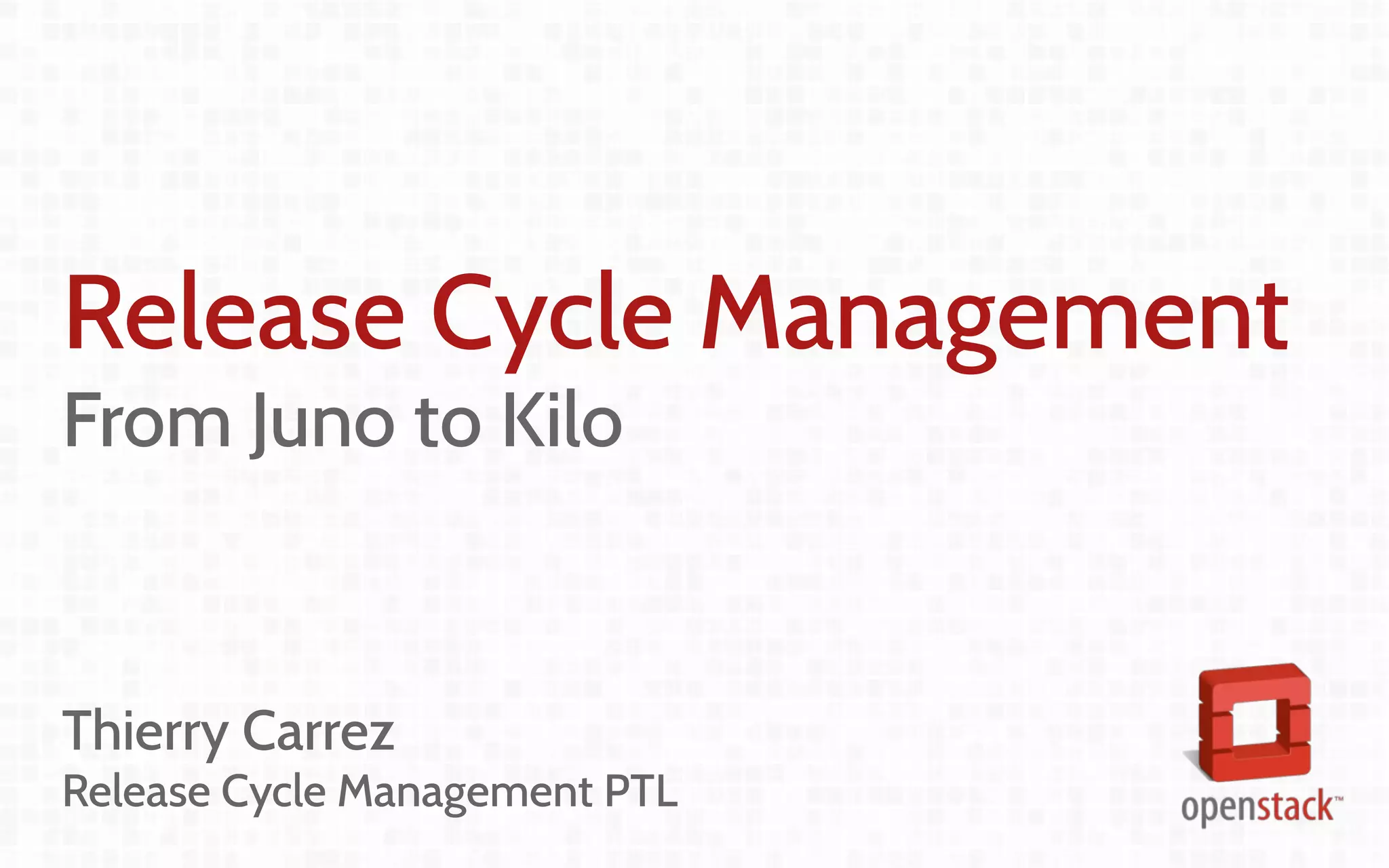 The document discusses the coordination and leadership challenges faced in producing OpenStack, particularly under the management of Thierry Carrez as the release management PTL. Key points include the evolution of release cycle management from Juno to Kilo, the introduction of new organizational structures, and the implementation of vulnerability management practices. It highlights specific dates for feature freeze and release, as well as changes to meetings and tooling to improve collaboration and efficiency.
