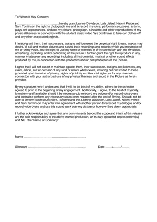 The document grants Leanne Davidson, Laila Jaleel, Naomi Pierce and Sam Tomlinson permission to photograph, record audio of, and use the person's likeness in connection with their student music video and related projects. It allows perpetual use of photographs, recordings, and likeness for exhibition, advertising, and promotion of the video. The person agrees not to make legal claims regarding the use of their likeness and understands post-production voice work may be done by someone else if they can't complete it.