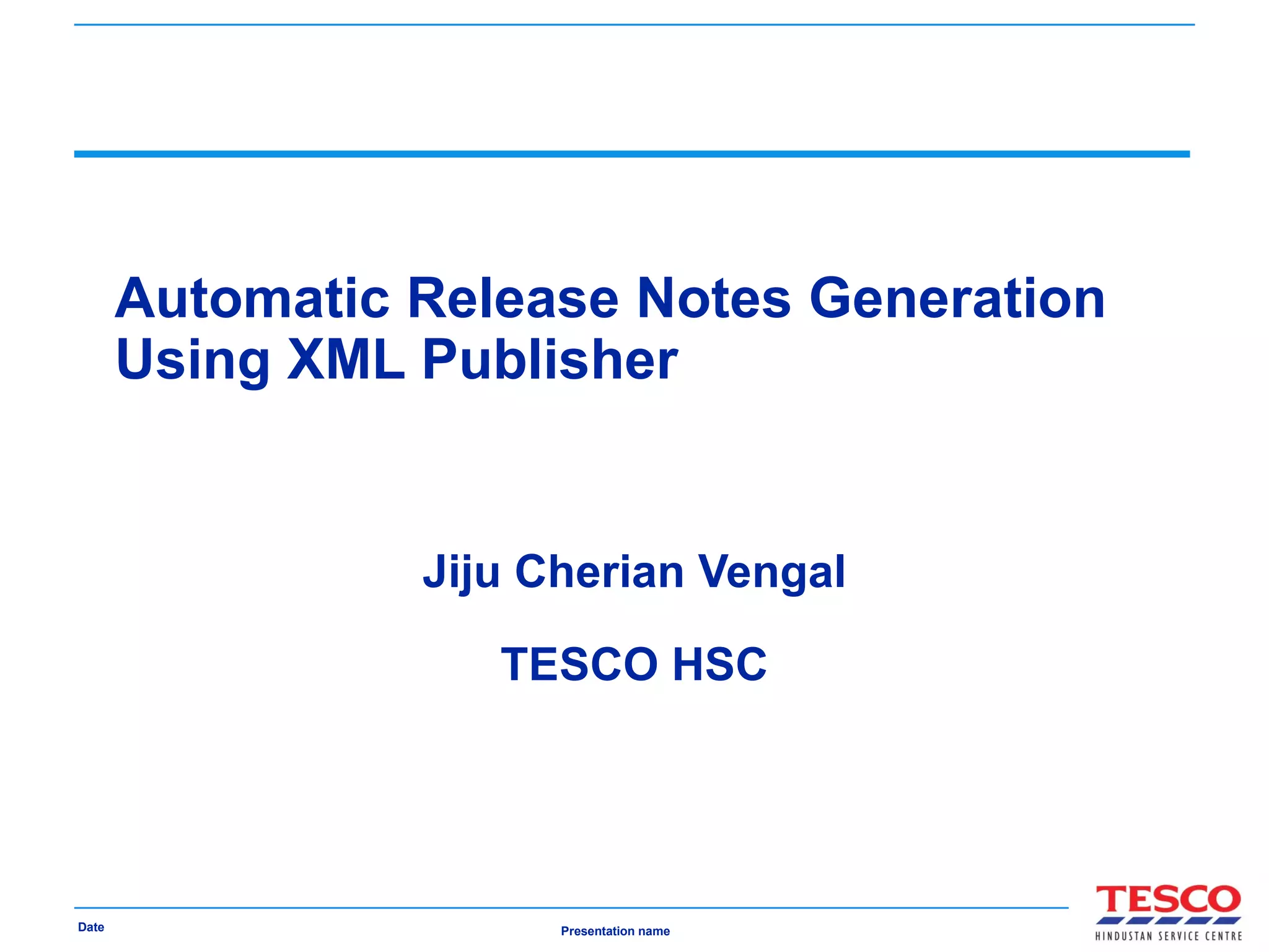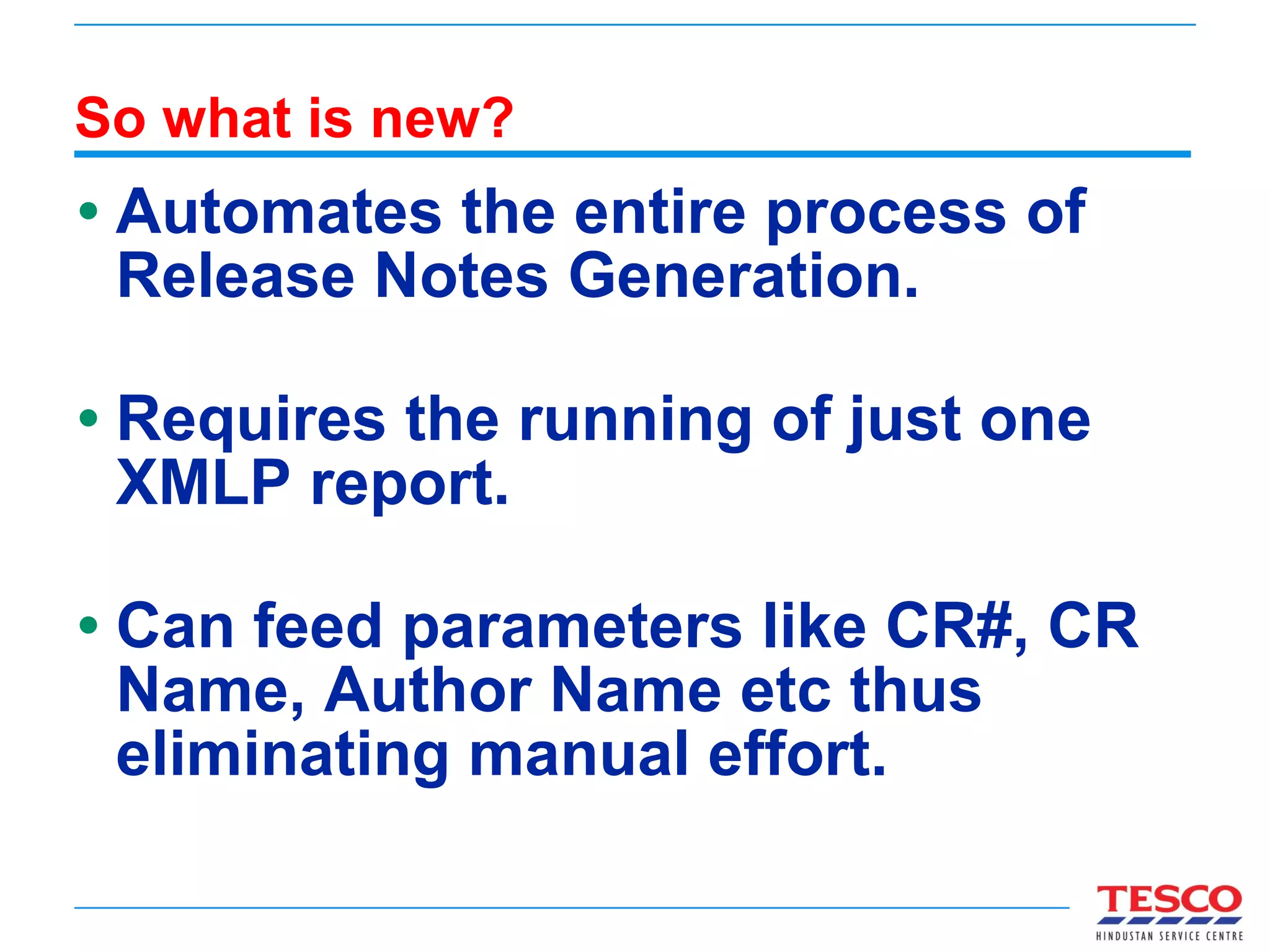 The document describes an automated release notes generation tool using XML Publisher that streamlines the process by requiring only one report run and eliminating manual efforts. This new system reduces errors, saves development time, and allows for easy updates to templates, offering a more efficient solution than existing methods. Users can generate release notes by navigating to specific reporting tools and entering project details, with plans for further improvements suggested.