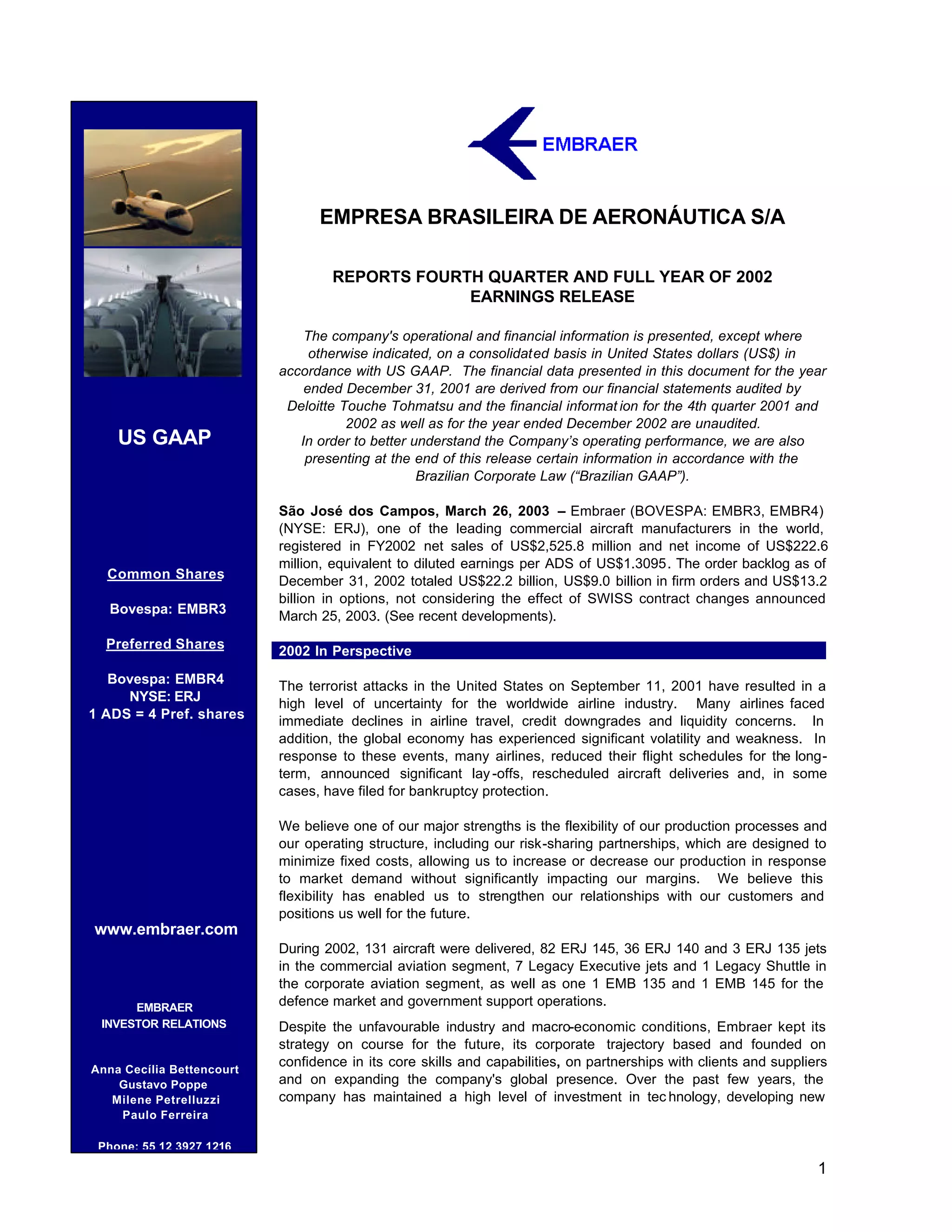 1) Embraer reported full year 2002 net sales of $2.5 billion and net income of $222.6 million, with an order backlog of $22.2 billion.
