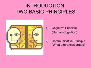 Relevance theory proposes that human cognition is geared toward maximizing relevance. It has two main principles: the cognitive principle states that the mind seeks relevance, and the communicative principle states that utterances create expectations of optimal relevance. The theory provides an explanation for how utterances are comprehended through hypotheses about explicit and implied meanings. It also addresses issues like lexical narrowing, loose language, and irony. Relevance theory aims to provide an experimentally testable model of pragmatic language comprehension.