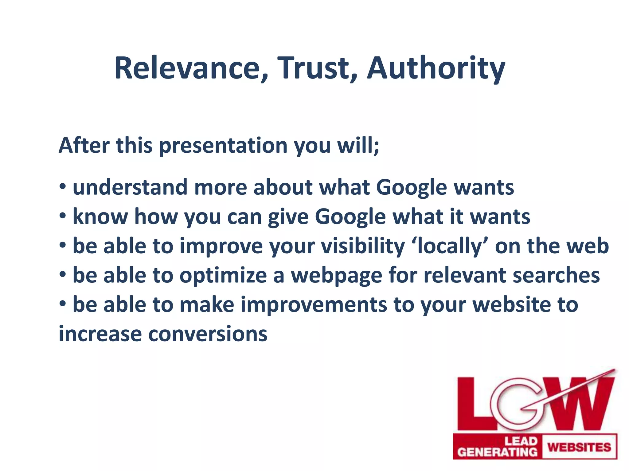 The document provides guidance on improving online visibility for local businesses through SEO strategies tailored for Google. Key topics include keyword research, establishing trust and authority via Google+, optimizing web pages for relevant searches, and leveraging multimedia content. Best practices for enhancing local search rankings include consistent contact information, customer reviews, and effective content distribution.