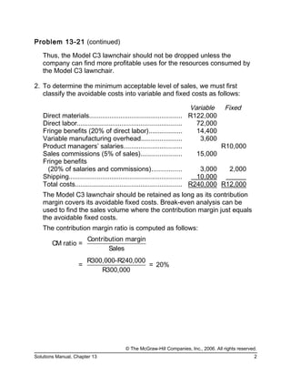 The document discusses financial decision-making regarding the model C3 lawnchair and product profitability in a manufacturing context. It emphasizes the importance of avoidable costs and contribution margins in determining whether to discontinue a product or prioritize production based on constraint resources like welding time. Additionally, it illustrates the impact of direct labor classification as either fixed or variable on overall production decisions and profitability.