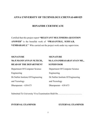 The document describes a project report submitted by three students - Prasanth, Surya, and Vembarasu - for their bachelor's degree in computer science and engineering. It discusses developing a system called "Relevant Multimedia Question Answering" that can enrich textual answers found in community question answering forums by adding relevant images and videos. The system aims to determine what type of media to add, generate queries to search for multimedia data, and select and present appropriate images and videos to enhance the original textual answers.
