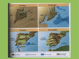 Paleozoico hai 570-230 millónsde anos ● Ten lugar a oroxenia herciniana. Dos mares que cubrían a meirande parte da Península xurdiron cordilleiras de dirección NW-SE formadas por materiales como granito, pizarra y cuarcita. ● Ao W érgueuse o Macízo Hespérico arrasado logo pola erosión e convertido en zócolo, unha meseta inclinada cara o E. ● Á fin do Paleozoico aparceron outras terras emerxidas: macizo do Ebro , macizo catalano-balear , macizo de Aquitania e macizo bético-rifeño, tamén erosianados e convertidos en zócolos.
