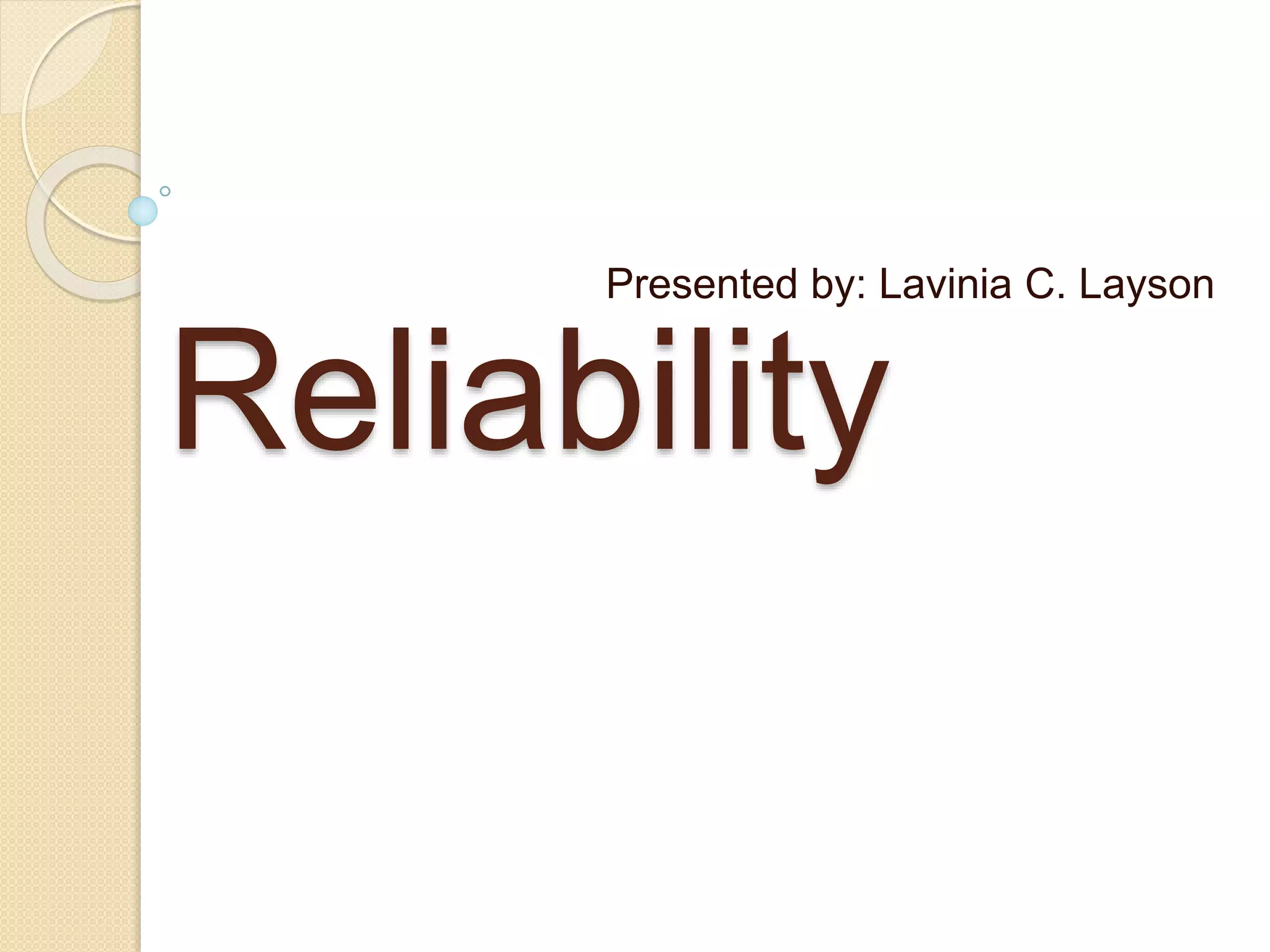 This document discusses the concept of reliability in engineering. It defines reliability as the ability of a product to perform as expected over time under specified operating conditions. There are four elements of reliability: probability of satisfactory performance, specified time period, and specified operating conditions like temperature, vibration, etc. Reliability is influenced by factors like the numerical probability value, intended function of the product, expected life, and environmental conditions. The document outlines key aspects of reliability management, design, production, and transportation that influence a product's reliability.