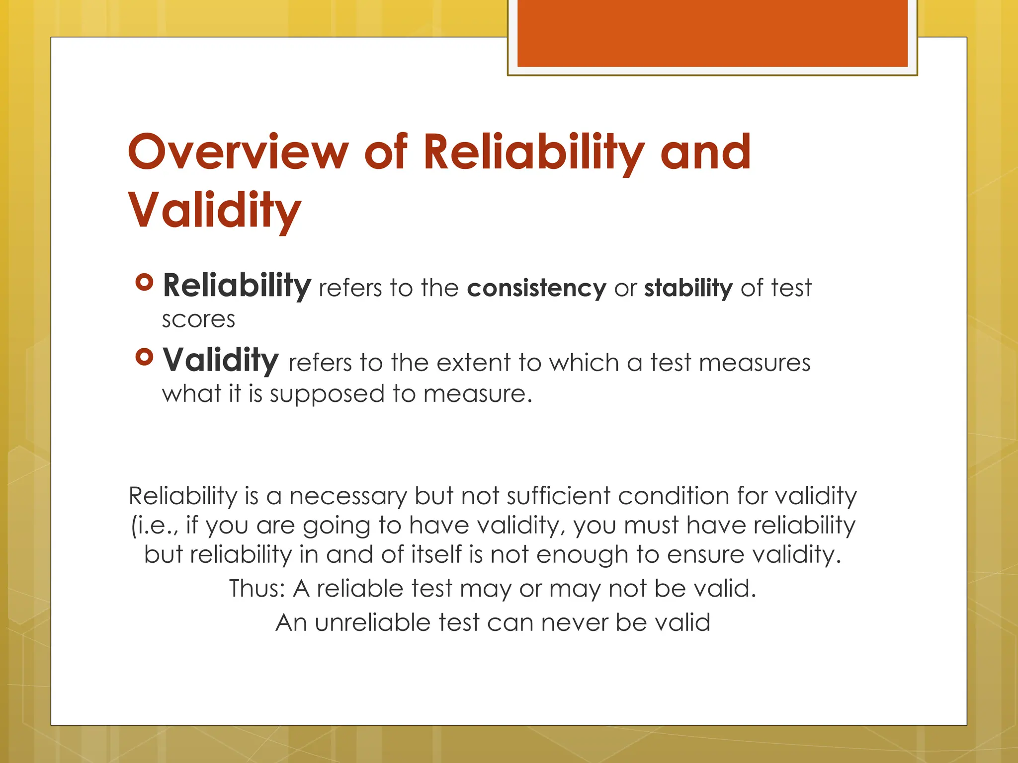 The document outlines the concepts of reliability and validity in testing, explaining that reliability refers to the consistency of test scores while validity measures whether a test accurately assesses its intended construct. It highlights that a reliable test does not guarantee validity, illustrated by examples of unreliable questionnaires. Various methods for measuring reliability, such as test-retest, parallel forms, and internal consistency, are discussed along with associated coefficients that indicate reliability strength.