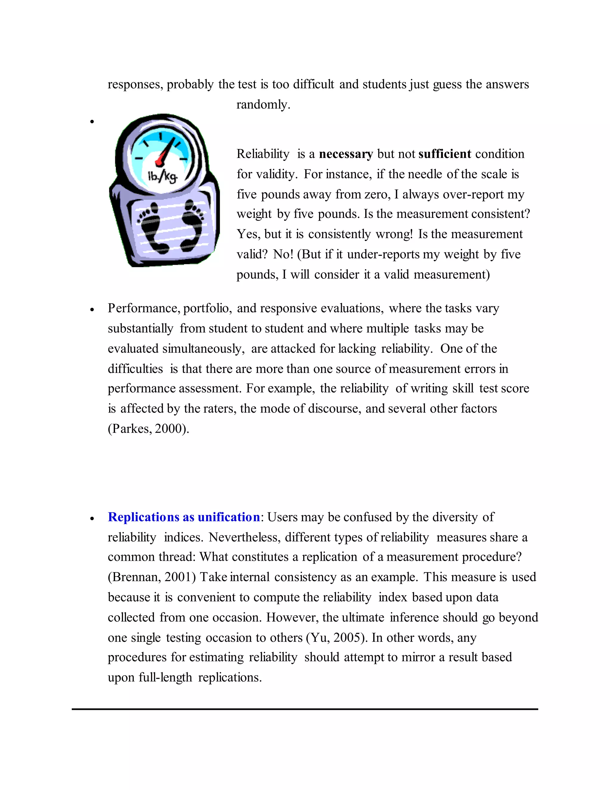 - Reliability is a necessary but not sufficient condition for validity - a test can consistently measure something incorrectly. Validity ensures a test accurately measures the intended construct.