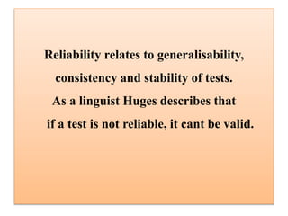 Reliability relates to the consistency and stability of test results. A test is considered reliable if it produces similar outcomes under consistent conditions. There are different types of reliability: internal reliability assesses consistency between items on a test, and external reliability assesses consistency of results over time. Common methods to measure reliability include split-half methods, test-retest methods, and measuring inter-rater reliability between different evaluators. Reliable tests consistently measure the intended construct and produce stable results over time.