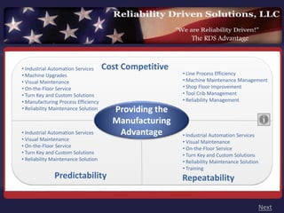 Reliability Driven Solutions, LLC provides maintenance management consulting and industrial automation services as a certified veteran-owned organization. They offer services such as industrial automation, machine upgrades, visual maintenance, on-the-floor service, and turnkey solutions to improve manufacturing process efficiency and reliability. RDS aims to help customers through cost-competitive services, predictability, repeatability, and real-time web reporting.