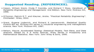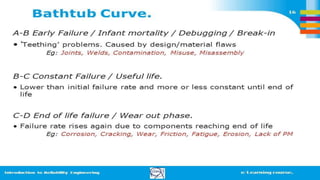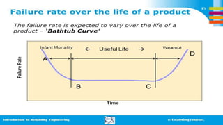 2) Explaining hazard rates and different failure rate models like Weibull and bathtub curves.