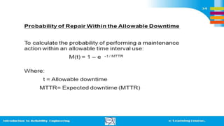 1) Defining reliability as a function of time and comparing it to other probability functions like failure distribution and survivor functions.