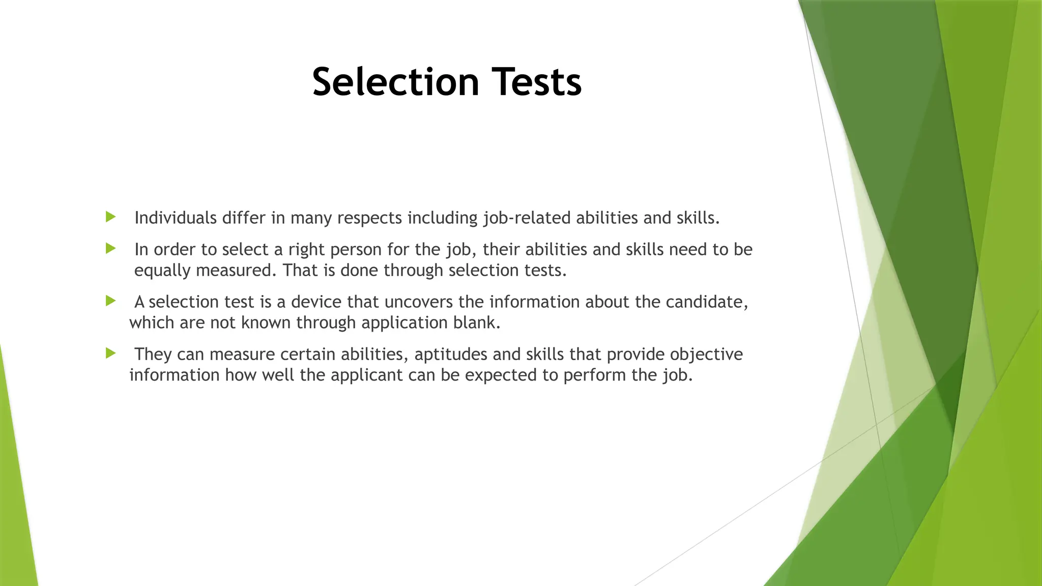 The document discusses the importance of selection tests in hiring by measuring candidates' job-related abilities and skills. It outlines various types of tests, including aptitude, intelligence, achievement, situational, interest, personality, and honesty tests, as well as the concepts of reliability and validity in the context of these tests. Reliability refers to the consistency of test scores, while validity pertains to how accurately a test measures what it is intended to assess, with methods for demonstrating both types outlined.