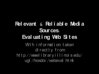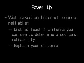 This document provides criteria for evaluating the reliability of internet sources, including: whether the source is recommended by a faculty member, cited in other credible sources, from a reputable domain like .edu or .gov, lists author credentials, provides accurate and objective information, and is current and easy to navigate. Questionable sources mentioned include advocacy sites and Wikipedia, which should not be cited in academic papers.