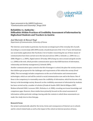 This paper examines the practices Austrian high school students and teachers use to evaluate the credibility of online information. The study found that students heavily rely on the Internet, primarily Google, to complete school assignments with little guidance from teachers. Students typically only use a single search term on Google and trust the top results without thoroughly evaluating the information sources. They also ignore printed materials like books in favor of secondary Internet sources. While the Internet is widely used for schoolwork, assessment of information credibility is not adequately addressed by either students or teachers.