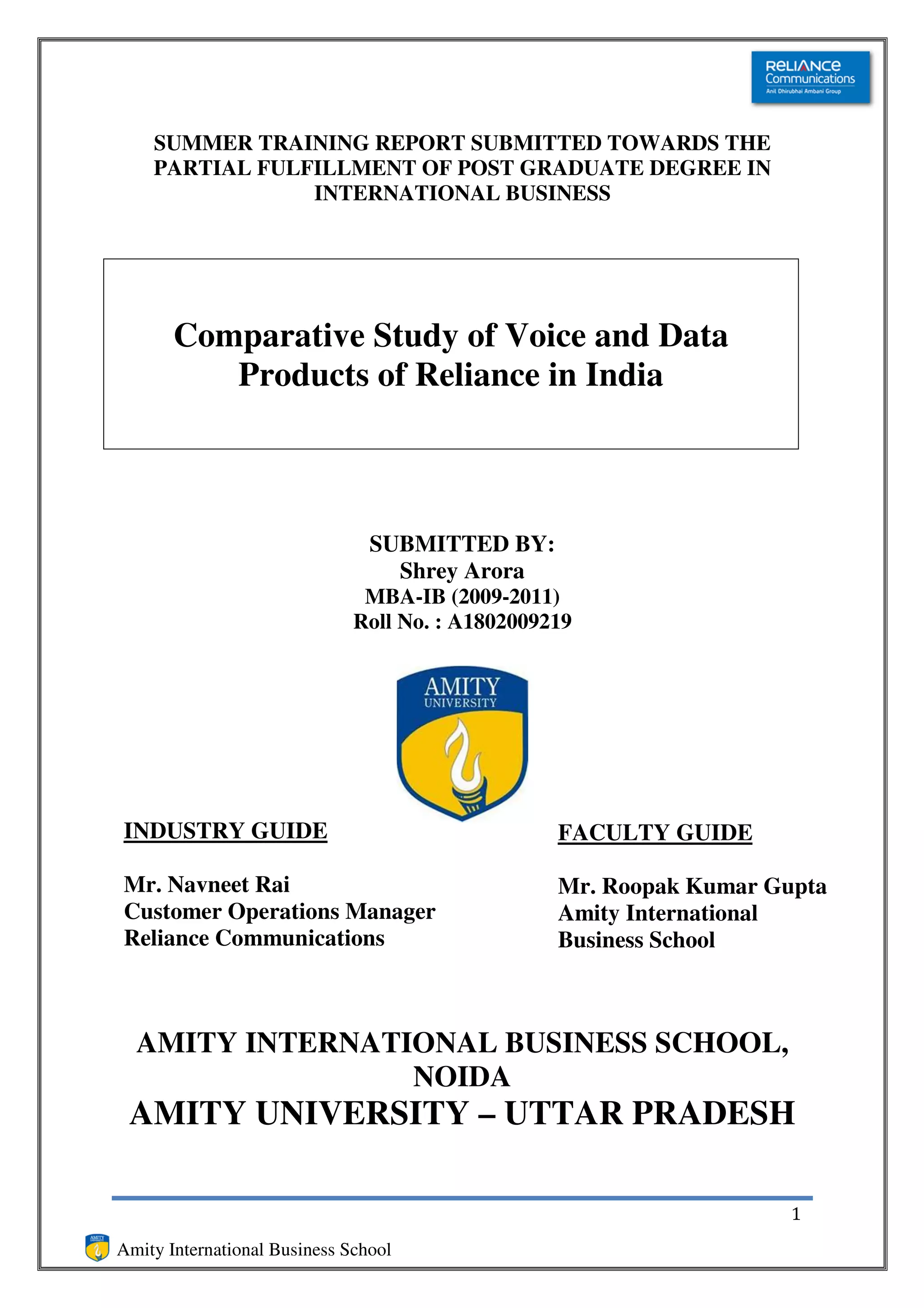 This document provides a summary of a student's summer training report submitted for their post graduate degree in international business. The report details a comparative study of voice and data products offered by Reliance in India. The student conducted primary research through a questionnaire sent to over 100 Reliance enterprise customers to understand customer satisfaction levels and identify any issues with services like leased lines and VPNs. The responses received were analyzed and findings were reported to management while maintaining client confidentiality. The training provided practical experience in business processes, customer interactions, and learning about the telecom industry and Reliance's products and services.