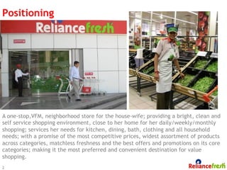 The document outlines a marketing strategy for a neighborhood store targeting housewives, focusing on providing a clean, self-service environment with competitive prices and a wide product assortment for household needs. It includes a detailed breakdown of product categories, top vendors, and sales distribution by region, as well as an analysis of current visual merchandising practices and challenges. The document highlights the need for improved signage, organization, and consistency in visual communication to enhance customer experience.