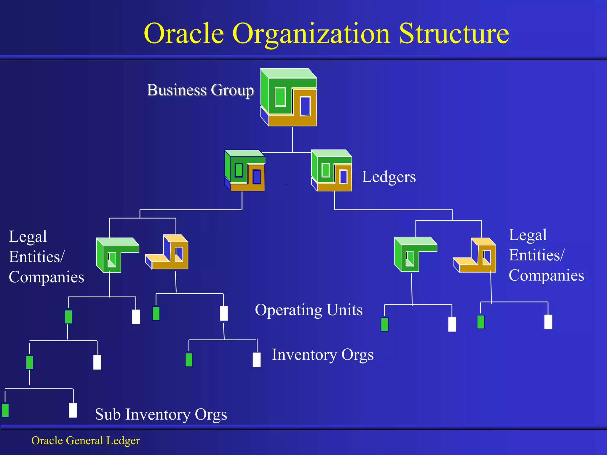 The document describes Oracle General Ledger and the organization structure of Reliance Group. Reliance Group uses Oracle GL which allows for multiple legal entities/companies organized into operating units and business groups. The Reliance structure includes a parent Reliance company with various subsidiaries each assigned a company code and organized under different ledgers based on currency (USD, INR, CAD) for accounting and financial reporting purposes.