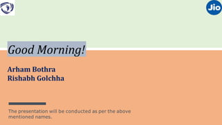 Reliance Jio introduced in India in 2015 and has since had a major impact on the Indian telecom industry and society. The presentation summarizes Jio's history and launch, products/services, tariff plans, and impact. It discusses how Jio's affordable data and voice calls disrupted the market, increasing internet usage but also potentially negative effects like overuse of online content and less real-world interaction. The presentation provides an overview of Jio's influence in bridging the digital divide while acknowledging some risks to health and education.