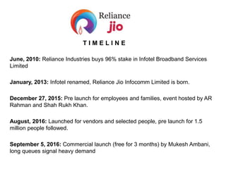 Reliance Jio was launched in September 2016 after extensive pre-launch testing. It aimed to make high-speed internet a basic necessity in India and support the Digital India campaign. During pre-launch, it partnered with celebrities and the Prime Minister to promote the brand and its vision. Coverage of Jio's launch varied across media - with some taking a neutral approach and others appearing biased. While tariffs were welcomed, connectivity issues were a concern raised on social media. Competitors responded by beefing up networks and customized plans to retain customers. Overall, Jio was seen as disruptive but a work in progress due to ongoing technical challenges.